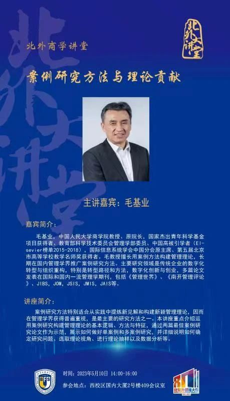 主讲人简介:毛基业是中国人民大学商学院教授、原院长;国家杰出青年科学基金项目获得者,教育部科学技术委员会管理学部委员,中国高被引学者(Elsevier榜单2015-2018),国际信息系统学会中国分会原主席, 第五届北京市高等学校教学名师奖获得者。他擅长用案例方法构建管理理论,长期在国内管理学界推广案例研究方法。他的主要研究领域是传统企业的数字化转型与组织重构,特别是转型路径和方法,数字化创新与创业。他有多篇论文发表在国际和国内一流管理学期刊,包括《管理世界》、《南开管理评论》、JIBS,JOM,JSIS,JMIS,JAIS等。