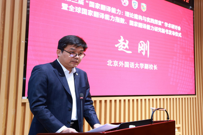 赵刚向莅临会议的各位领导、专家、学者表示欢迎,向协办单位、战略合作伙伴以及学术支持单位表示感谢。他向与会代表提出几点期望:第一,希望大家能够围绕国家翻译能力的理论建构与实践探索展开深入研讨,为推动国家翻译能力研究的深入发展贡献智慧和力量;第二,跨越学科界限,开展跨学科交流与合作,共同解决翻译学科所面临的重要问题;第三,关注专业学科的发展趋势,尤其是翻译技术发展带来的挑战和机遇,为翻译学科的未来发展提供新的思路和方向;最后,希望参会者在会议期间充分交流,畅所欲言,互相学习。