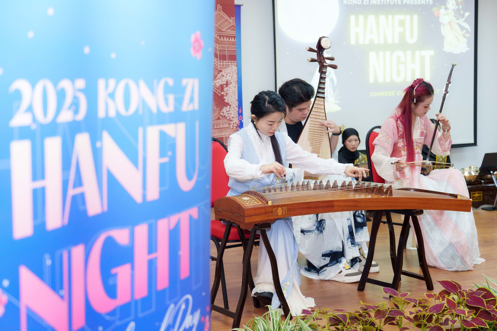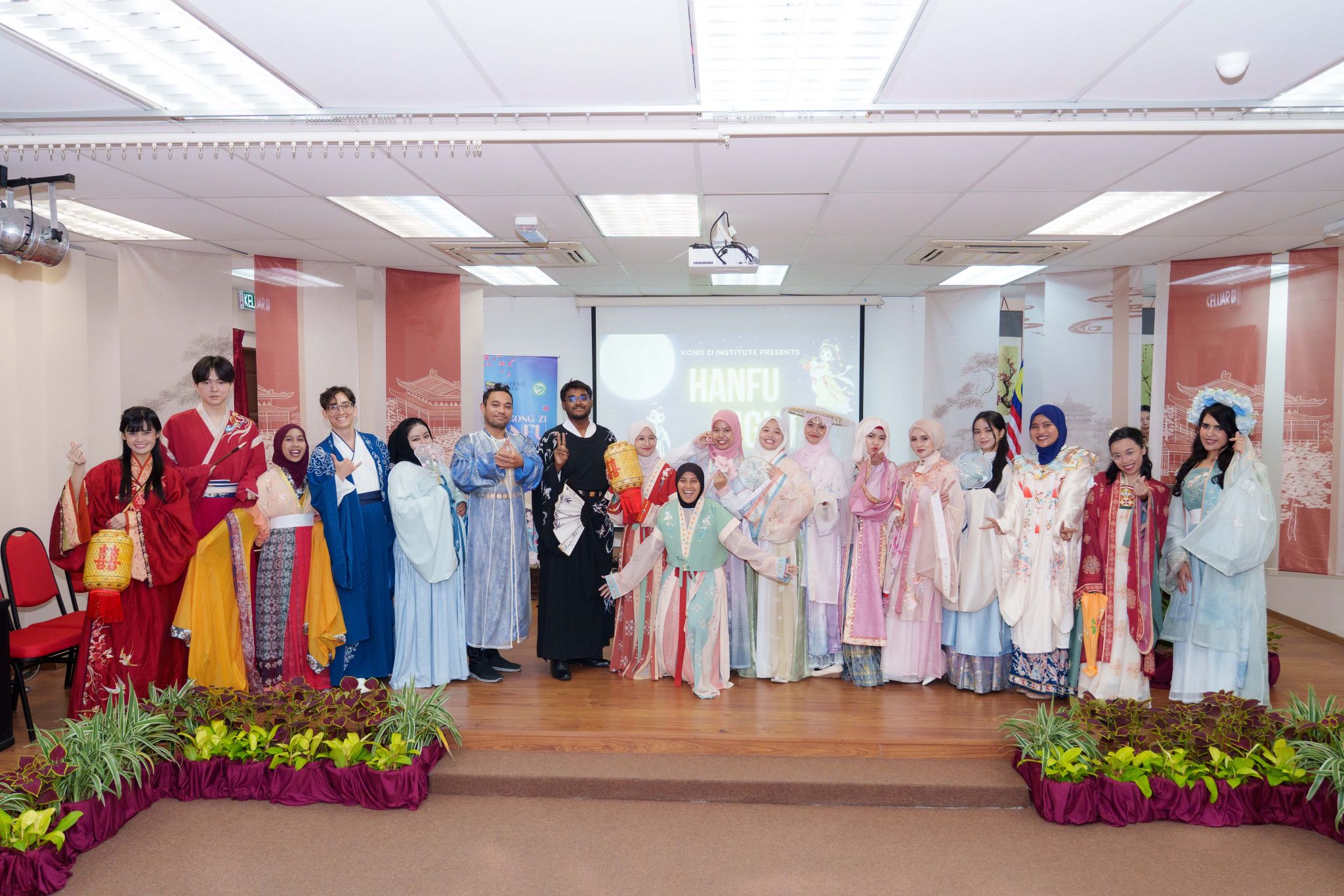当晚的“月下汉风汉服之夜”将活动推向高潮。在中马特色节目开场后,由孔院学生带来的汉服走秀成为最大亮点。传统服饰与现代舞台艺术的结合,生动展现了中华服饰文化的典雅与韵味,赢得了现场观众的热烈反响。这一环节不仅是一场视觉盛宴,更是一次成功的文化自信展示。